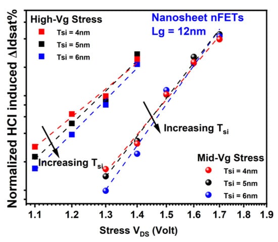 HCD as a function of stress drain voltage in GAA nFETs for different Tsi. Each data point is the mean value of more than seven devices stressed at the same condition. Enhanced HCI damage at thinner Tsi can be attributed to a higher corner field at scaled diameters of the curved region [18,21,22]. Stress gate voltage is equivalent or close to stress drain voltage under high-Vg stress conditions. Stress gate voltage is roughly between 0.5× and 0.7× of stress drain voltage for Mid-Vg stress conditions.