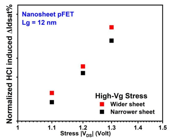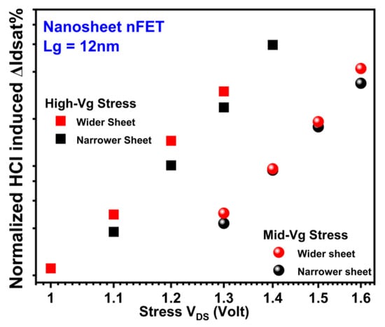 HCI reliability’s dependence on Wsheet in NS is influenced by two competing mechanisms that have conflicting effects. On the one side, the NS FET of wider sheets has a higher current and more intense self-heating effect (SHE) under the same stress condition, both contributing to an increase in HCD [12,18,25]. On the other side, the contribution from the flat areas of the sheets becomes more significant than that from the corners at wider Wsheet. HCDs in NS nFETs and pFETs with two different Wsheets are depicted in Figure 13 and Figure 14, respectively. Slightly higher HCD was observed at a wider Wsheet in both NS nFETs (1.6~2.1× of that in the narrower Wsheet under high-Vg conditions and 1~1.3× of that in narrower Wsheet under mid-Vg conditions) and pFETs (1.2~1.6× of that in the narrower Wsheet), suggesting a higher impact from the elevated current and enhanced self-heating effect [18].