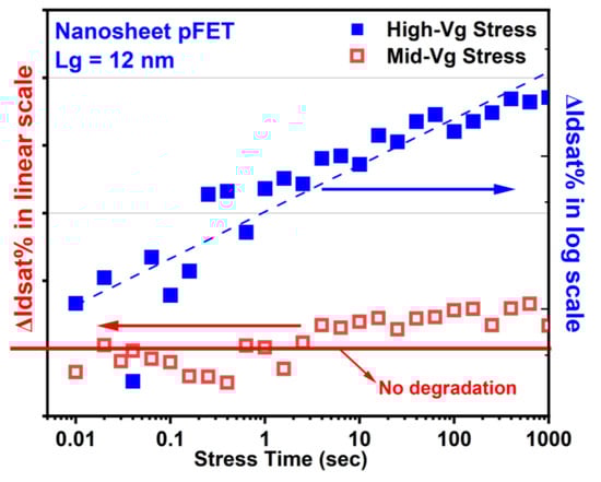 Figure 16 illustrates a typical evaluation of ΔIdsat (%) with stress time during HCI stresses for GAA NS nFETs with a gate length of 12 nm [6,18].