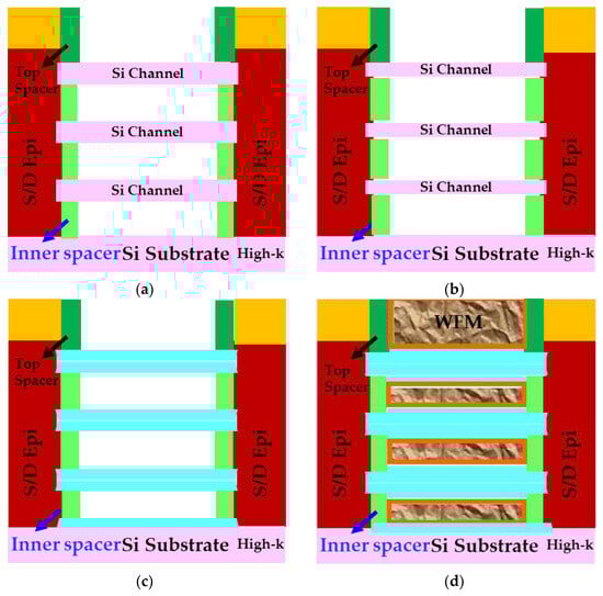The continued scaling of FinFET technology beyond the 3 nm node encountered significant performance and scaling hurdles [7,26,27]. These challenges have motivated a shift from the tri-gate architecture to a vertically stackable GAA structure [27,28,29,30,31,32,33,34], aiming to mitigate short channel effects more efficiently while simultaneously boosting performance.