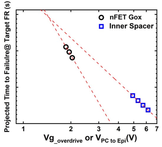 In Figure 20, using the β value, the time to 63% fail (T63%), VAE reported in [11,44], the time to failure of Gox nFETs and the inner spacer are projected to a specified failure rate and target area (for Gox) and run length (for inner spacer), and plotted as a function of stress voltage. Due to the shallower β and lower VAE, the inner spacer of NS is more prone to failure compared to gate oxide at voltage closing to standard operating conditions, especially when a stringent low failure rate target is required. Scaling the inner spacer thickness for future technology nodes poses significant challenges to TDDB reliability. Achieving uniformity in both thickness and shape and the profile optimization of the inner spacer are crucial for success in this endeavor [11,42].