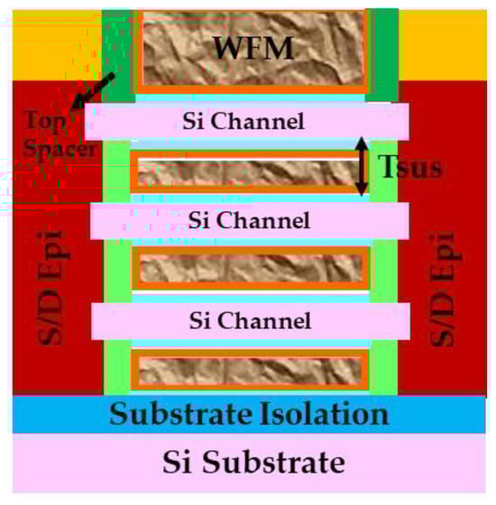 A cut of GAA NS FET across the source-drain region with substrate isolation [9]. The spacing between Si channels, Tsus, with potential impact on HKMG metal fill, and thereby gate stack reliability, is also highlighted in the schematic.