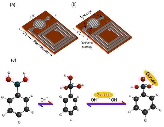 In this work, we utilized an IDC and a planar inductor to prepare an RF-based glucose biosensor. Figure 1a,b shows the schematics of the IDE with a planar inductor on the same board and the proposed glucose biosensor, respectively. We used phenylboronic acid (PBA), classified as a meso-Lewis acid and a polymer, to prepare the IDC’s glucose-sensitive dielectric material. In water-based environments, PBAs and hydroxide ions react to form boronates. The concentration of hydroxide ions determines how many boronates are formed. To put it another way, boronate formation completely depends on the pH. The glucose’s hydroxyl groups produce a cyclic ester, which is then consumed when combined with the boronate form. As a consequence of this, the incorporation of glucose results in a reduction in the boronic acid form, which in turn leads to a drop in the apparent pKa [,]. The reaction is presented in Figure 1c. A drop in the pKa of an organic acid occurs when the dielectric constant is increased, and vice versa [].