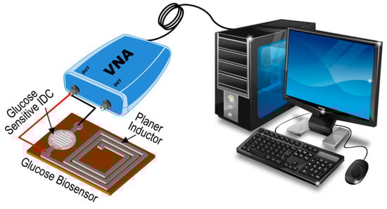A schematic of the experimental setup of the proposed glucose-sensing system is presented in Figure 3. First, we injected one drop of DI water as a reference solution to set the reference benchmark. Then, various doses of glucose solution were dropped onto the IDC of the sensing element to observe the resonance frequency shift due to the variation in different glucose concentrations. Contact between the glucose solution and the IDC’s sensing membrane or dielectric material altered the membrane’s dielectric constant, which influenced the capacitance of the glucose-sensing element. As a result, the resonance frequency shifts, which depends on the glucose concentration.