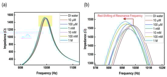 Figure 4a illustrates the shift in the resonance frequency as the concentration of glucose solution varies from 10 μM to 1 M. The resonance frequency values corresponding to these concentrations are around 99.75, 99.702, 99.68, 99.62, 99.595, and 99.54 MHz. The difference in the resonance frequency shift between the reference solution (DI water, resonance frequency 99.78 MHz) and the 1 mM glucose solution was about 99.7 kHz. Based on the data shown in Figure 4b, it can be observed that an increase in concentration leads to a red shift in the resonance frequency. The resonance frequency of the sensing element undergoes a red shift due to the increase in the dielectric constant of the IDC when the concentration of glucose increases. This increase in the dielectric constant leads to an increase in the capacitance of the sensing element.