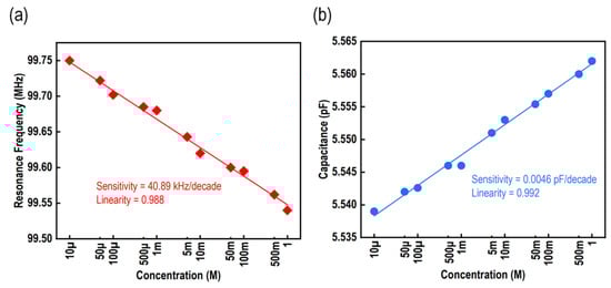 Performance of the sensor. (a) Resonance frequency vs. different concentrations of glucose solutions; and (b) capacitance vs. glucose concentration.