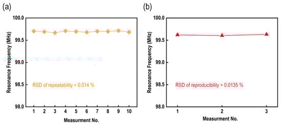 Ten data values were taken into consideration to evaluate the repeatability and relative standard deviation (RSD) of the proposed passive RF glucose biosensor. The resonance frequencies of these values were 99.702, 99.69, 99.669, 99.708, 99.695, 99.679, 99.70, 99.697, 99.714, and 99.682 MHz, respectively, and the data are graphically presented in Figure 7a. A statistical metric that expresses the precision of a group of values is called the relative standard deviation (RSD), and repeatability is a term that describes the consistency of measurements when the same conditions are applied. In the context of this discussion, the recorded data points represent several measurements that were taken using the proposed passive RF glucose biosensor under conditions that were considered to be comparable. The measurements were taken at a concentration of 100 µM of glucose solution in this instance. To determine repeatability, we examined the degree to which these measurements cluster around an average. This provided an indication of the sensor’s precision and reliability when applied to comparable situations. The relative standard deviation (RSD) was relatively low, approximately 0.014%, indicating that the proposed RF glucose biosensor provided data that was trustworthy and consistent under the specified parameters. From Figure 7a, we can also see that no remarkable variation occurs within the ten measurements, and so we can conclude that the proposed glucose biosensor offers a stable response.
