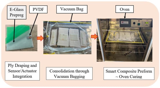 Following a vacuum-assisted consolidation molding process, depicted in Figure 1, smart composite samples of varying sizes were fabricated by an embedding technique. The approach employed aligns with the design and fabrication processes detailed by Langat et al. []; nonetheless, in the present study, distinct materials and a unique wiring procedure for the active elements were utilized.