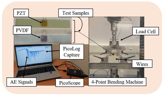 The experimental setup for the analysis of the potential of the embedded PZT and PVDF patches to detect faults within fiber-reinforced composites in real time while in passive mode is shown in Figure 2. The 200 mm × 30 mm × 1.7 mm smart composite beams presented in the figure below were subjected to a 4-point bending test on the Zwick Roell Z100 material testing equipment, manufactured by ZwickRoell (Ulm, Germany) to facilitate this evaluation. The loading span was set to half of the support span, following the ASTM D6272 standard []. The test sample was preloaded to 1N and continually deflected with a 5 mm/min cross-head speed until it failed.