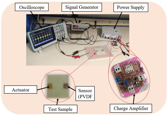 In contrast to the passive method discussed earlier, which relies on damage-dependent signal responses for acoustic wave generation in damage monitoring and severity determination, the active sensing approach involves the continuous generation of elastic waves traveling through a material. Figure 9 illustrates our testing approach, utilizing a pitch-catch technique with a single actuator sensor configuration. In this setup, PZT generates signals by applying a step input signal, as depicted in the figure. Subsequently, a PVDF sensor receives the signals on the opposite end of the plate. The findings given in the preceding section partially influenced the selection of these components.