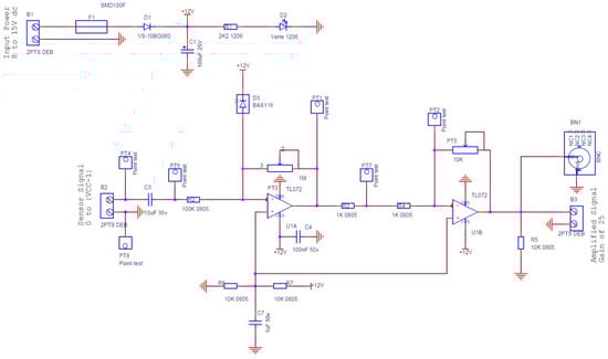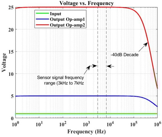 Figure 4 illustrates the circuit of the amplifier specifically designed and manufactured for this study. The configuration consists of two cascaded operational amplifiers operating in closed-loop mode with negative feedback. This design ensures that the operational amplifier (OP-Amp) does not reach saturation and functions in the linear mode. At the input of the sensor signal, a capacitor is incorporated to eliminate any DC signal, allowing only the preservation of the AC signal response generated by the Lamb wave. Following the gain formula of the inverting amplifier (-Rf/Rin) and utilizing the given parameters, the voltage gain was determined to be 25. A simulation was conducted to determine the amplifier’s bandwidth. Figure 5 depicts the simulation results, revealing the −3 dB frequency point at 374 kHz.