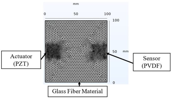 A finite element analysis based on the COMSOL Multiphysics software’s solid mechanics module was implemented to complement and validate the experimental data in the study of the active sensing SHM approach. The developed model, illustrated in Figure 6 with the associated dimensions, included defined material properties for the glass fiber (refer to Table 1). For the piezoelectric elements, materials were selected from COMSOL’s material library. The analysis assumed perfect bonding at the material interfaces in the smart composite throughout the test, ensuring that no slippage occurred between different layers []. In this approach, a step signal was applied to the PZT, and a domain probe captured the transient response from the PVDF sensor. The model utilized a free tetrahedral mesh with a normal density to optimize the computation time, selected after a mesh refinement approach, which showed a negligible impact on the received signal. The study, executed in the time domain, employed a fixed time step of s, matching the acquisition period in the experiment. Similar damages to those induced in the experiment were investigated to analyze the variability.