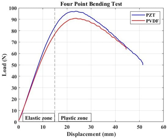 Load–displacement curve resulting from the 4-point bending test with noticeable linear (elastic) and non-linear (plastic) zone. Maximum load attained by a sample with PZT is 97.1214 N, and it is 90.8469 N for that with an embedded PVDF patch.