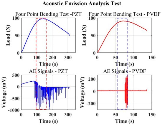 Concurrently, after reaching the preload value, PicoLog 7, a data logging software in streaming mode, was set to collect real-time data from the embedded sensor and display the response, which relied on the PicoScope 2000 series (2204A) for data acquisition. This recording provided relevant information for the SHM evaluation, including the time of material failure and the maximum flexural strength that it could withstand shortly before damage propagation. In contrast to other studies within the same framework, such as those conducted by Lampani et al. [] and Tuloup et al. [], which solely rely on the evolution of electrical capacitance to evaluate damage, our current work captured acoustic signals. This approach was employed to assess the suitability of both PVDF and PZT materials in detecting damage initiation. Furthermore, it was extended to verify the influence of integrating both materials into fiber-reinforced composite structures.