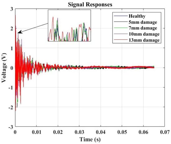 In this study, the Lamb wave data received from the sensor were considered for analysis in both the time domain and the frequency domain. The experiments were repeated seven times under identical conditions to ensure the reliability of the results. The goal was to understand how the signals changed and quantify the severity of the damage concerning the hole diameter’s influence. This exploration is crucial as signal variations can indicate changes in material properties, signaling the presence of damage in the structure. For the time domain study, the signal responses of varying specimen conditions were compared to the “Healthy” structure posing as the baseline. The variations in the local amplitude concerning the increase in the hole diameter were evaluated.