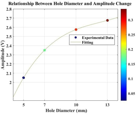 Figure 12 displays the relationship between the amplitude and damage size (hole size). The plot illustrates a correlation between these variables in the structure. The observation reveals that the response amplitude follows a cubic function when a hole is introduced during the SHM test utilizing Lamb waves. This increase in amplitude can be attributed to the altered structural stiffness resulting from the introduced hole damage, facilitating easier wave propagation. To further understand this correlation, a polynomial interpolation approach was employed to fit the response (). The resulting correlation function is presented in Equation (2), highlighting a non-linear relationship between the amplitude and hole size.