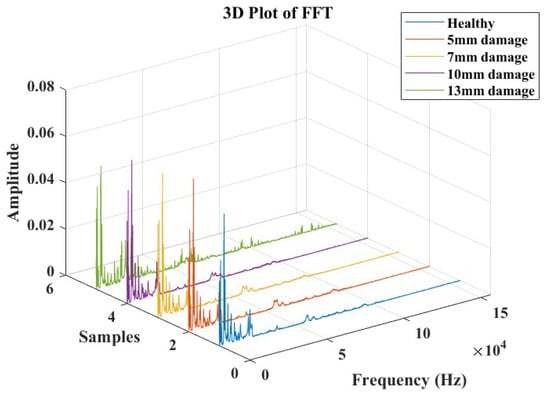However, this amplitude-based correlation function may not be sufficient to describe the severity of the damage in the composite structure, given the non-linear behavior of fiber-reinforced composites with alterations in the material properties; therefore, extracting more feature parameters to perform damage diagnosis and description in the composite is imperative while employing the SHM strategy. Following this determination, a further signal processing approach utilizing FFT was implemented to extract more valuable features that could best describe the presence of the damage and the influence of its size.