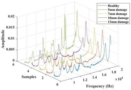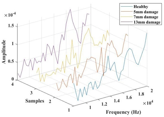 In the frequency domain, Lamb wave signals were analyzed using Fast Fourier Transforms, as illustrated in Figure 13. The time domain signals were transformed, considering a data acquisition frequency of 312 kHz. The objective of this analysis was to identify a combination of parameters that could offer an indicative correlation to the response corresponding to the presence of damage. Based on observations from these plots, a specific frequency range between 8 kHz and 20 KHz was extracted (as depicted in Figure 14), where the influence of the introduced damage on the structure appeared to be significant. This extraction was undertaken to streamline the evaluation of pertinent parameters that could offer a reliable damage index for the SHM study.