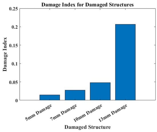 A damage index plot against damaged structures in SHM is shown in Figure 15. The plot illustrates the variations in damage indices across different structures, highlighting the increasing trend with an increased damage size. The damage indices serve as a crucial indicator of structural health, facilitating the identification of deteriorating conditions that require attention. This analysis supports the implementation of condition-based maintenance strategies in aerospace structural systems.