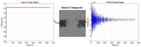 Figure 16 displays the outcomes of the finite element method analysis using the pitch-catch sensing approach implemented in COMSOL. The results exhibit a transient response similar in form to the one obtained from the experimental data presented in Figure 9. A similar attenuation trend is seen in the simulation’s Lamb wave signal, which converges with the experiment’s observed period. These findings complement and validate the experimental study conducted within the framework of active sensing in this work.
