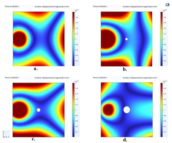 The surface plots of the analyzed sample cases displaying the displacement magnitude for visualization of the disturbance created by damage on the Lamb waves. In these representations, (a) illustrates the healthy structure in its intact state, (b) shows a structure with 5 mm hole damage, (c) demonstrates a structure with 7 mm hole damage, and (d) displays a structure with 13 mm hole damage.