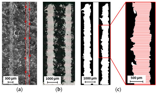 The width of the weld depends on the combination of laser power, laser speed and, in the case of single tracks, specifically on the substrate material. The weld width is also influenced by preheating the platform. Therefore, the single-track samples are produced on a 1 mm thick WE43 material (Figure 2a), which ensures adequate heat dissipation. The 1 mm thick material is fabricated with process parameters, i.e., laser power of 250 W, laser speed of 450 mm/s and hatch distance of 80 µm, based on the study [31]. The width of each weld is measured on the top images taken with an optical microscope (Olympus SZX7, Olympus, Tokyo, Japan). The width of single welds is the average value calculated from five measurements (Figure 3a).