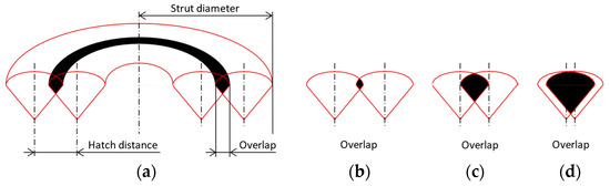 The overlap of the neighboring weld together with the process parameters determines the energy density in the strut. The overlap (OL) depends on the weld width (WW) and hatch distance (HD) and represents the joint between two welds created by remelting the material (Equation (2), Figure 4). In the case of this study, the overlap is calculated from the width of the hollow struts. Therefore, it changes with the strut diameter. Lower overlap and laser power at a higher laser speed result in lower energy density. Low energy can result in areas of unmelted material being trapped in sharp-edged pores. High energy leads to overheated material, which supports the formation of spherical pores [16]. Therefore, the optimum value of overlap that suppresses pore formation and results in a sufficient bond between adjacent welds should be determined. For this purpose, the geometry of vertical hollow struts with two welds is used (Figure 4a). The hollow struts with two welds (2W) are produced with diameters from 0.5 to 3 mm with a step of 0.5 mm. Three values for laser power (100, 150 and 200 W) and laser speed (400, 600 and 800 mm/s) are chosen to cover the range of selected process parameters. The hatch distances are 0.06, 0.1 and 0.14 mm for each combination of laser power and laser speed, corresponding to an overlap of 20 to 80%. A total of 162 samples are produced. The optimum overlap is determined based on the porosity between two welds in the 2W hollow strut.