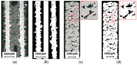 Metallographic sections are used for two types of samples, i.e., 2W hollow struts and struts. The samples are metallographically processed and imaged with a Keyence digital microscope. The images are converted into binary monochrome images. Porosity is represented by the percentage of black areas in the sample section. For 2W hollow struts, the porosity is measured between the two adjacent welds according to the design of specimens (Figure 5a,b). The porosity of the struts is measured on metallographic sections (Figure 5c,d). In the contour scanning strategy, the center of the vertical and inclined struts as well as the lower part of the inclined struts is a critical point for porosity formation, as previous research has shown [19,20]. Therefore, the struts are polished towards the center and the relative material density values are used as a relative value for the comparison of the strut porosity.