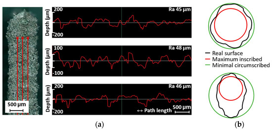 (a) Example of measurement of the surface roughness Ra on the side of the strut in three lines; (b) measurement of the dimensional deviation by fitting maximum inscribed and minimum circumscribed cylinders.