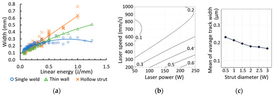 (a) Dependence of the width of single welds, thin walls, and hollow struts on linear energy; (b) width of hollow struts with a diameter of 1.5 mm based on the laser power and laser speed; (c) mean of average width dependent on strut diameter.