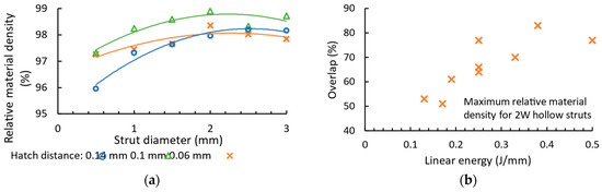 For the 2W hollow struts, the hatch distance, which determines the overlap of welds (Equation (2)), shows a strong dependence on the strut diameter (Figure 8a) and linear energy (Figure 8b). The hatch distance in three batches for a linear energy of 0.25 J/mm shows a similar trend of relative material density in the range of 0.5–3 mm (Figure 8a). The maximum relative material density is measured at a hatch distance of 0.1 mm, which corresponds to an overlap of 60–68% according to the weld width and Equation (2). The overlap as a function of linear energy for the maximum relative material density for all combinations of process parameters and a diameter of 1 mm is shown in Figure 8b. The plotted values show that a high linear energy requires higher overlap values to achieve a high relative material density between two welds of 2W hollow struts. The overlap values are between 45 and 85% for all diameters; therefore, this range is used for the design of the strut experiment.