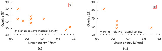 For the vertical and inclined struts with a diameter of 1 mm (Figure 8c,d), the dependence of the overlap for the maximum relative material density on the linear energy shows an increasing trend. An overlap of more than 80% leads to a relative material density of more than 99.3% for both vertical and inclined struts produced with a linear energy of less than 0.1 J/mm. An overlap of less than 60% results in a relative material density of over 98.4% at a linear energy of over 0.6 J/mm.