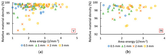 The area energy (Equation (3)) is used to describe the effects of laser power, laser speed and overlap on the relative material density in the struts (Figure 9). The relative material density of the vertical struts (Figure 9a) increases with the area energy. An area energy of up to 2.6 J/mm2 leads to a relative material density of less than 95% for some of the vertical struts with a diameter of 1, 2 and 3 mm. In contrast, struts with a diameter of 0.5 mm are produced with a relative material density of over 97.6%. The area energy of over 2.6 J/mm2 leads to a relative material density of over 96.4% for diameters of 1, 2 and 3 mm. In the case of diameters of 0.5 mm, the relative material density is less than 95%. The relative material density of the inclined struts (Figure 9b) shows no clear dependency. The area energy of up to 2 J/mm2 appears to be promising for struts with a diameter of 0.5 mm. An area energy of more than 2 J/mm2 is more suitable for struts with a diameter of 2 mm.