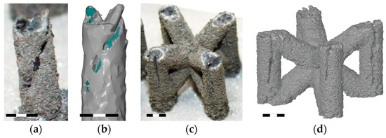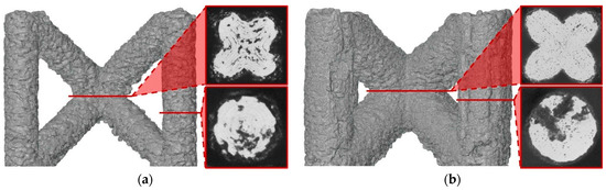 In the BCCZ cells with a diameter of 2 mm, irregular pores appear between the welds (Figure 10a), which are typical for low energy. The low energy of the process parameters means that only part of the material is melted, leaving unmelted areas between the tracks in which unmelted particles are trapped [19]. The BCCZ cells (Figure 10b) with a diameter of 3 mm have irregular pores with a volume of more than 0.05 mm3 in the inclined struts, but the node of the cell is without large pores. This could be due to the laser trajectories, which are different for the cell node than for the struts (Figure 1). Due to the sharp edges in the center, the material is heated at a higher temperature, which supports the melting of the powder particles [35]. Vertical struts of 3 mm BCCZ cells showed deformations (holes) on the surface that go through the material of the struts and are not recognized as pores by the CT scan (Figure 10b).