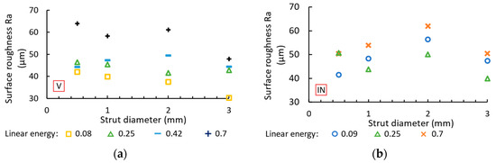 The surface roughness Ra measured on the side of the struts is shown in Figure 12. Vertical (Figure 12a) and inclined (Figure 12b) struts are mainly influenced by the linear energy (laser power and laser speed), and the overlap parameters have no influence on the surface roughness. For vertical struts, the best results are measured at a linear energy of 0.08 J/mm, with a surface roughness Ra in the range of 30–42 µm. Inclined struts achieve an Ra of 42–50 µm at a linear energy of 0.09 J/mm (diameter of 0.5 mm) and a linear energy of 0.25 J/mm (diameter of 1, 2, 3 mm). A high linear energy (0.7 J/mm) leads to a surface roughness Ra of 48–64 µm for vertical struts and 51–62 µm for inclined struts.