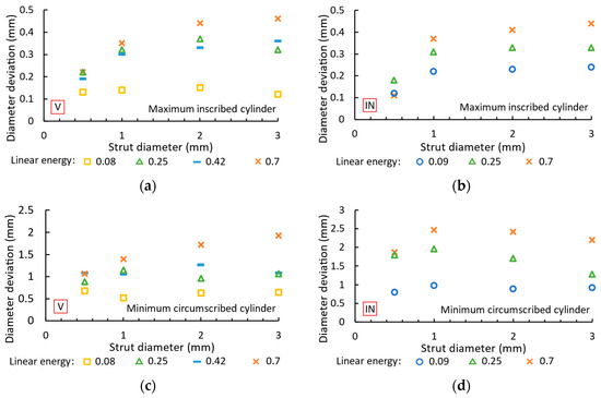 The diameter deviations of the produced struts from the nominal diameters are listed in Figure 13, based on the maximum inscribed and minimum circumscribed cylinders. The maximum inscribed cylinder, which represents the load-bearing cross-section of the strut [39], reaches a larger diameter than required for both vertical (Figure 13a) and inclined (Figure 13b) struts. The deviation from the diameter increases with the linear energy and strut diameter. For vertical struts, a linear energy of 0.08 J/mm leads to a diameter deviation in the range of 0.12–0.15 mm. A linear energy of 0.7 J/mm leads to a diameter deviation of 0.22–0.46 mm. Inclined struts achieve a diameter deviation of 0.12–0.24 mm with a linear energy of 0.09 J/mm and 0.12–0.44 mm with a linear energy of 0.7 J/mm.