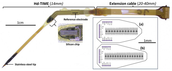 The hd-TIME probe comprises a polyimide ribbon with a stainless-steel micro-knife attached at the tip for easy implantation. The main probe body, which will reside inside the nerve, consists of a double-sided back-to-back structure, with each side containing a CMOS-compatible silicon chip with stimulation and recording sites encapsulated within a biocompatible and flexible support matrix. The hd-TIME has two variants. The short chip (a) has 12 stimulation and 48 recording sites. The long version (b) has 16 stimulation and 64 recording sites.