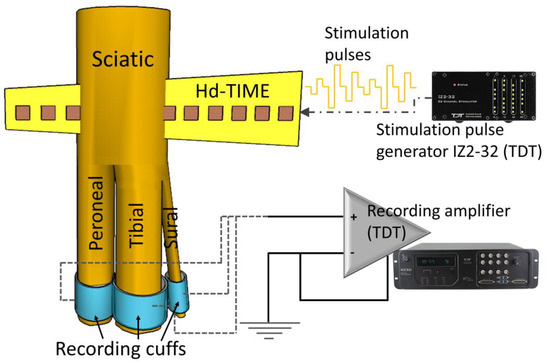 To maximize the performance of an intraneural interface, a novel high-density transverse intrafascicular multichannel electrode (hd-TIME) has been designed and fabricated [44]. The hd-TIME probe consists of a CMOS electronic chip thinned and embedded into a flexible biocompatible polyimide substrate for transverse insertion into human nerve fascicles for both recording and stimulation. The CMOS chip includes recording and stimulation sites and amplification and multiplexing circuitry for added functionality. The highest density implanted probe contains 64 neural recording electrodes and 16 fully reconfigurable neural stimulating electrodes. For more information about the fabrication, type, and functionality of the probe, read [44,45]. The stimulation modality of the hd-TIME will be used to encode sensory percepts via the evoked stimulation of the afferent nerve fibers within a fascicle.