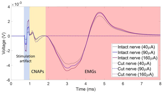One of the challenges when recording CNAPs is the contamination of the signal by the stimulus artifact, as well as electromyogram (EMG) signals from activated muscles. Figure 3 shows an exemplary recording where the CNAP, which is the smallest amplitude feature, is in between the stimulus artifact and the EMG signal. This CNAP signal was recorded using a monopolar cuff electrode with a distant ground on the tibial branch of the left sciatic nerve in one of the animals. This recording scheme results in large-amplitude CNAPs and thus a good signal-to-noise ratio compared to bipolar or tripolar recording schemes, but it also does not subtract out any of the unwanted signals, such as the stimulus artifact or EMG. The dashed lines in Figure 3 correspond to the recorded signals for various stimulus amplitudes after the nerve was transected distal to the recording cuff electrode. The CNAP signal changed only slightly after the removal of the EMGs via nerve transection, showing that the CNAP is indeed the second feature after the stimulus artifact and can be influenced by the presence of EMGs.