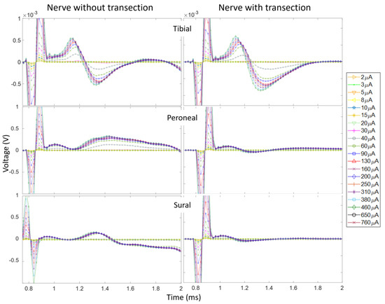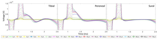 CNAPs obtained when the right sciatic nerve of Rat1 was stimulated with pw = 100 µs with various stimulation amplitudes. These results show the effect of the stimulus artifact obscuring the CNAPS due to an inadequate stimulation-to-recording distance. There was a 13 mm distance between the stimulating and recording electrodes. The recording was taken using cuff electrodes on distal branches of the tibial, peroneal, and sural nerves.