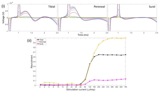 (i) CNAPs measured from stimulation (pw = 100 µs) in the left sciatic nerve for Rat1. Notice the relatively small voltage amplitude and selective activation of the tibial nerve branch. (ii) Resultant recruitment plots of the three respective nerve branches. A lot of noise is present in this measurement due to a low signal-to-noise ratio.