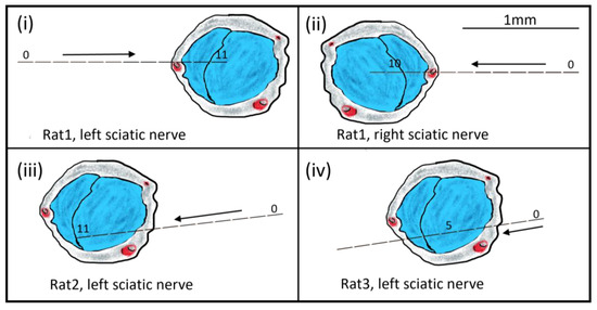 - Badia, J.; Pascual-Font, A.; Vivó, M.; Udina, E.; Navarro, X. Topographical distribution of motor fascicles in the sciatic-tibial nerve of the rat. Muscle Nerve 2010, 42, 192–201. [Google Scholar] [CrossRef] [PubMed]