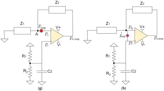 The final noise source in Figure 2a is called , which is the current noise of the operational amplifier. The equivalent circuit is shown in Figure 2h. We define as the output noise voltage due to In order to derive the noise gain, other voltage noise sources in Figure 2a as well as all DC voltage supplies are short-circuited.