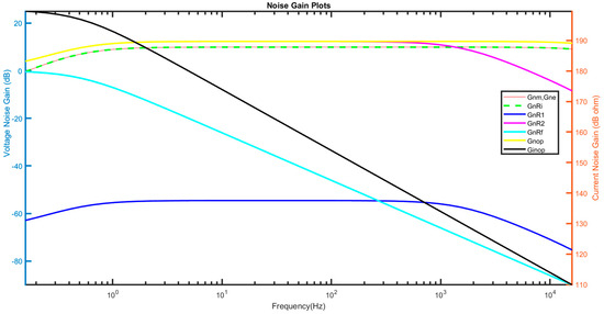 Figure 2g shows the equivalent circuit to derive the noise gain due to . In this circuit, we set other voltage noise sources in Figure 2a equal to 0 V, while current noise source is open-circuited. In addition, all DC sources are set to 0 V. Given that is the output noise voltage due to the corresponding noise gain equation is derived as follows: