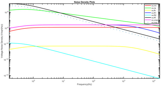 Figure 5 shows the noise densities of individual sources. This very important parameter is obtained by multiplying the individual noise gain with its corresponding voltage or current source. There are several important observations from Figure 5. First, the noise of Rf dominates at the lower frequency, as the value of Rf is set to 10 GΩ to push the lower cutoff frequency below 0.5 Hz. Second, the electrical thermal noise of the accelerometer dominates the high frequencies of the operating spectrum. Third, the lowest noise density is from R2, as its value is only 1 Ω.