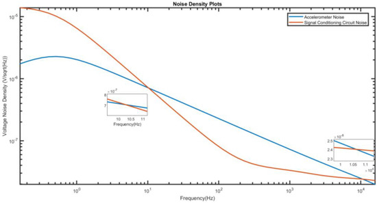 We use Equation (53) to separately calculate the total noise density of the piezoelectric accelerometer, as well as the total noise density of the charge amplifier. This information is useful to determine which one dominates in this system. The result is shown in Figure 6. The noise from the signal conditioning circuit dominates at low frequencies up to 10.28 Hz, while the noise from the sensor is higher after that point. As a reference, the piezoelectric accelerometer’s operating bandwidth is from 0.5 Hz to 10 kHz.
