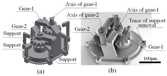 The SEM image confirms that the gears were fabricated according to the design shown in Figure 1a. Thus, in this study, the micro-3D printer was used to produce the gear train exactly according to the design.