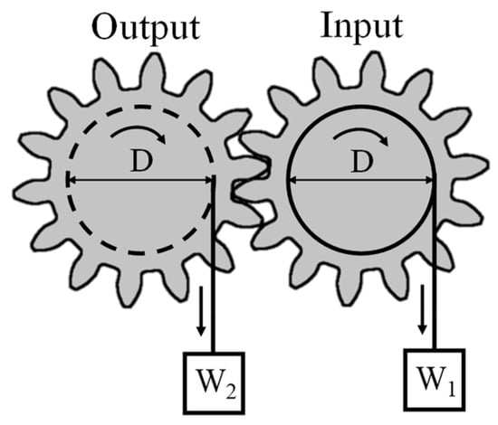 As shown in Figure 2, gears with an equal pitch circle diameter (D) are meshed and a gradually increasing load W1 is applied to the input side to generate a torque of T1 = D/2 × W1 on the input gear. The load W2 is measured at the moment when the torque balance is lost, and the torque on the output side is determined as T2 = D/2 × W2. The results of the torques applied to each gear are then used to determine the power transmission efficiency as T2/T1.