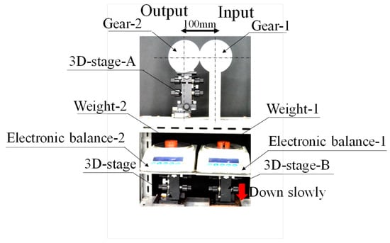 The instrument based on the moment balance method, shown in Figure 3, supported the shafts of the two gears with bearings. The centres of rotation of the two input and output gears were aligned using the three-dimensional stage (3D stage A) shown in Figure 3 and precisely meshed on the pitch circle of the gears. In addition, a 0.200 kg weight mounted on the electron balance was suspended by a flexible wire around the circumference of the pulley attached to the gears, as shown in Figure 2. The weights of the two gears reset the initial reading of the electron balance, and the balance of the torque on each gear was set at the start of the experiment by adjusting the height of each three-dimensional stage so that the output was zero in this state.
