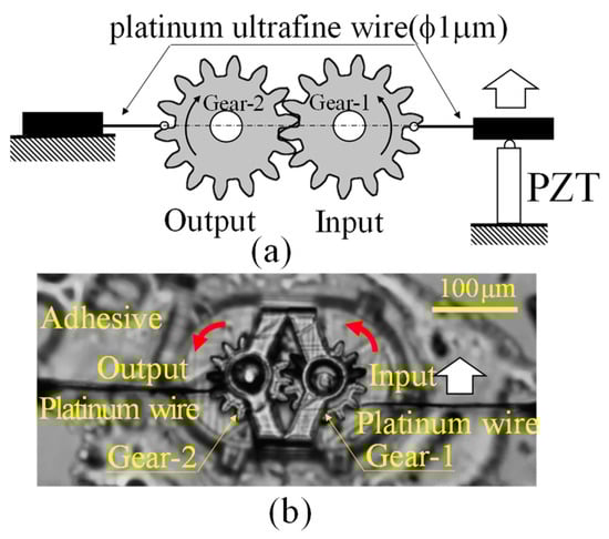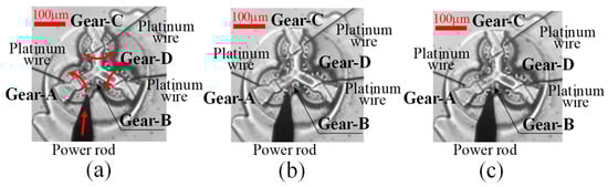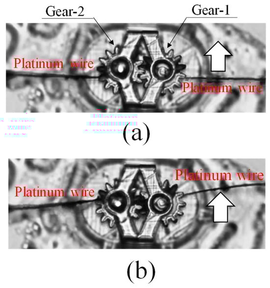Specifically, the moment when the ultrafine platinum wires from the left and right, shown in Figure 6a, were placed on the pitch circle of the micro-gear and started to push the teeth, as indicated by the white arrows, and the rotating gear shown in Figure 6b was recorded as an animation under a microscope. Moreover, the gear movement of the input and output was recorded as the extent of deflection of the ultrafine platinum wires.